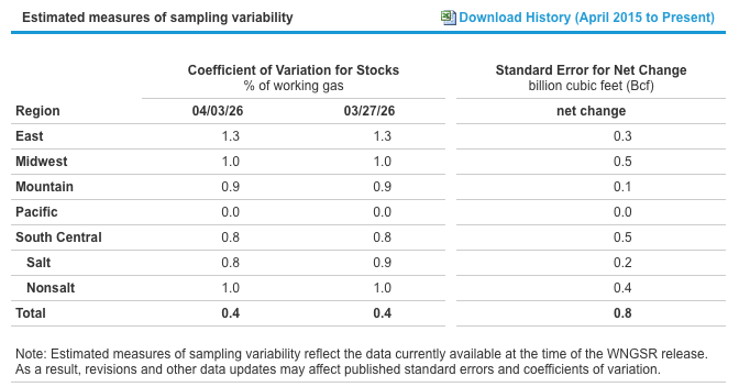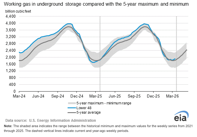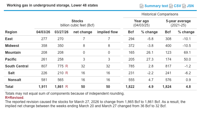 EIA Storage Report: Working gas in storage totaled 1,911 Bcf as of Friday, April 3, 2026, according to estimates from the U.S. Energy Information Administration. This reflects a week-over-week increase of 50 Bcf. Inventories are currently 89 Bcf above year-ago levels and 87 Bcf higher than the five-year average of 1,824 Bcf, placing total storage within the historical five-year range.