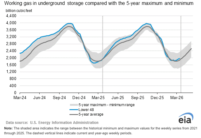 However, the broader market remains pressured by a growing storage surplus. Current inventories sit about 108 Bcf above normal and could expand to more than 170 Bcf by early May, which may weigh on prices longer term.