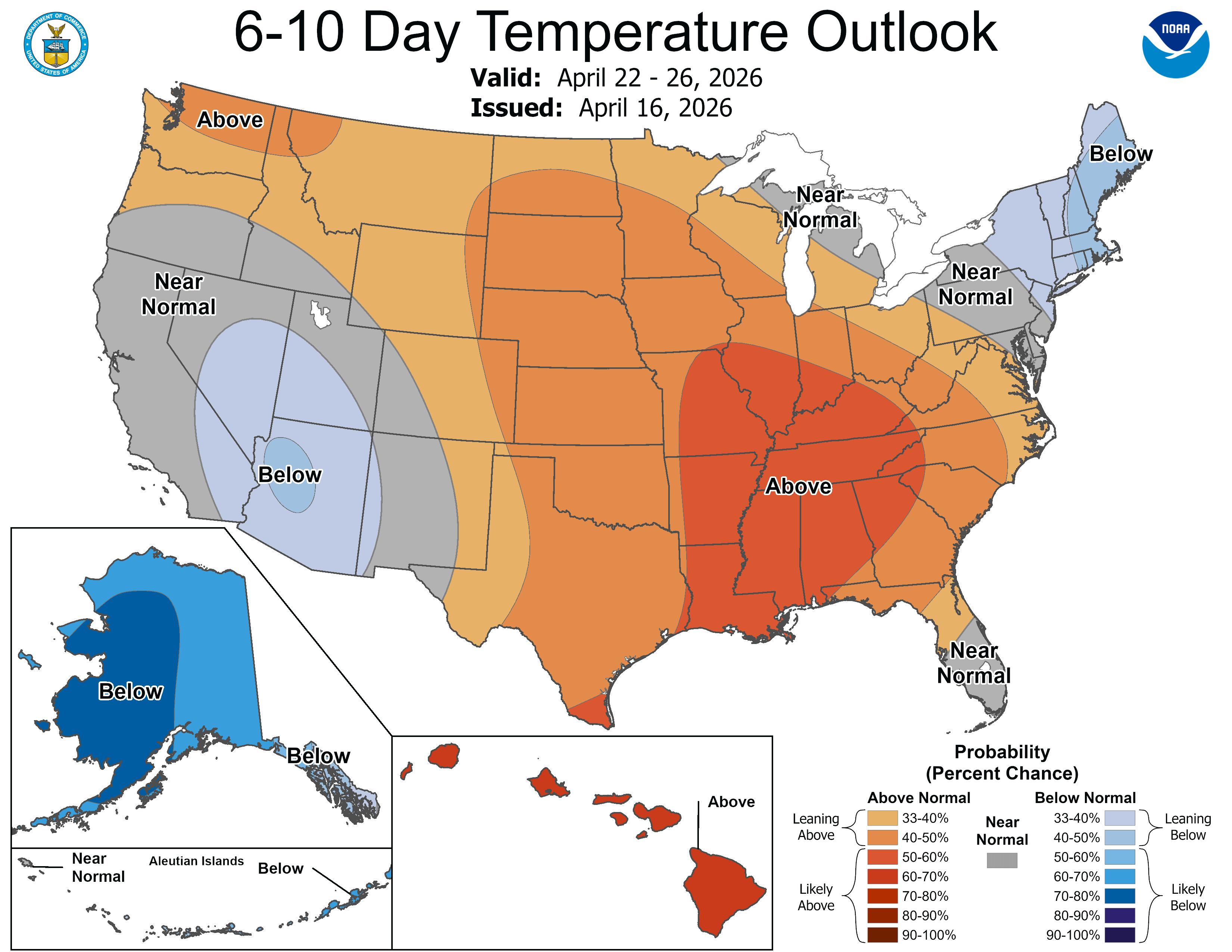 The South and Southeast are also favored to be warmer than normal, though with slightly lower confidence (50–60%).