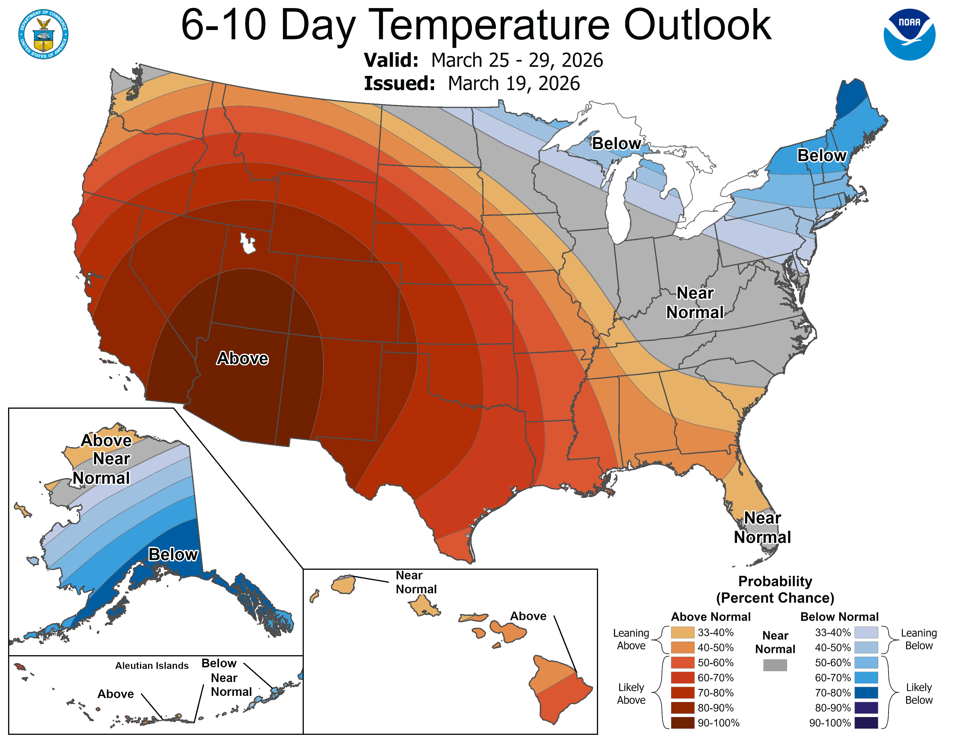 Weather: The April 2026 temperature outlook indicates that much of the U.S. is likely to experience warmer-than-normal conditions, with the strongest warmth expected across the South, Central states, and interior Northwest. This pattern is supported by current drought conditions, below-normal soil moisture, and below-average snowpack across much of the West, which will allow the land to heat up more quickly as spring progresses. Florida and Utah are particularly likely to see above-average temperatures, while northwestern Alaska may also experience warmer conditions. In contrast, parts of the Great Lakes, Northeast, Mid-Atlantic, and Pacific Northwest have roughly equal chances of being above, near, or below normal, reflecting greater uncertainty in those regions. Overall, most of the U.S. can expect an early, warmer start to spring, though cooler stretches may still occur in the northern and northeastern states. This forecast is based on the official 30‑day outlook discussion for April 2026 from the Climate Prediction Center of the National Oceanic and Atmospheric Administration.