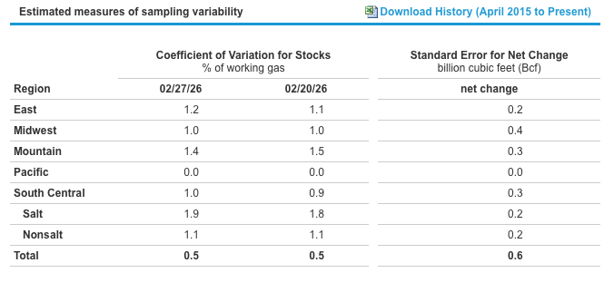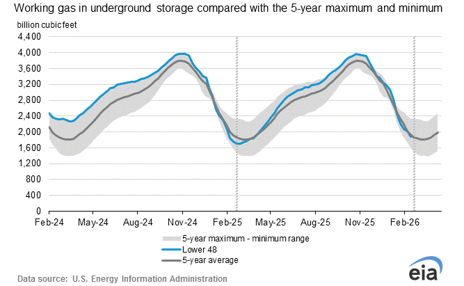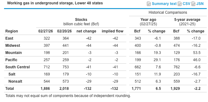 EIA Storage: The US Energy Information Administration reported a 132 Bcf withdrawal from natural gas storage for the week ending Feb. 27—slightly above expectations of 125 Bcf and higher than both the five‑year average pull of 96 Bcf and last year’s 106 Bcf. The storage deficit to the five‑year average widened to 43 Bcf (2.2%), while the surplus to 2025 levels narrowed to 115 Bcf (6.5%).